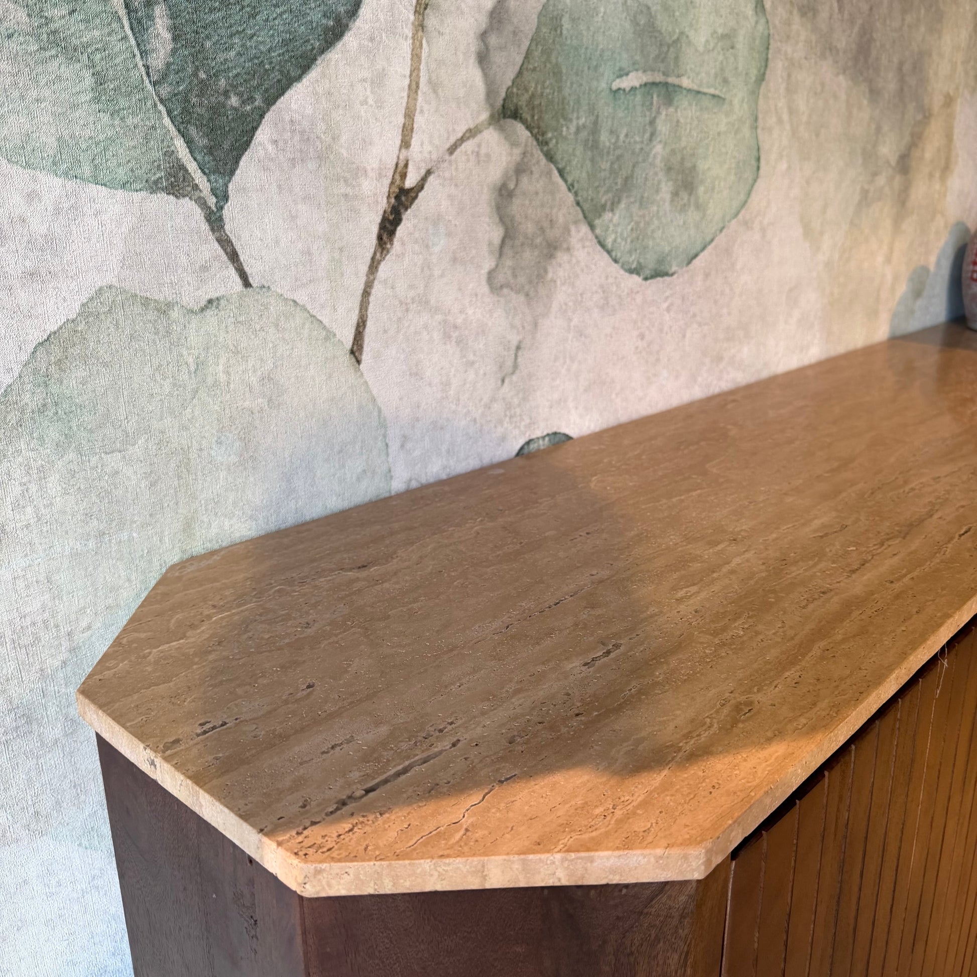 Een meubel dat je woonkamer een upgrade geeft. Dit Candolim dressoir combineert warme mangohout met luxe travertin natuursteen.