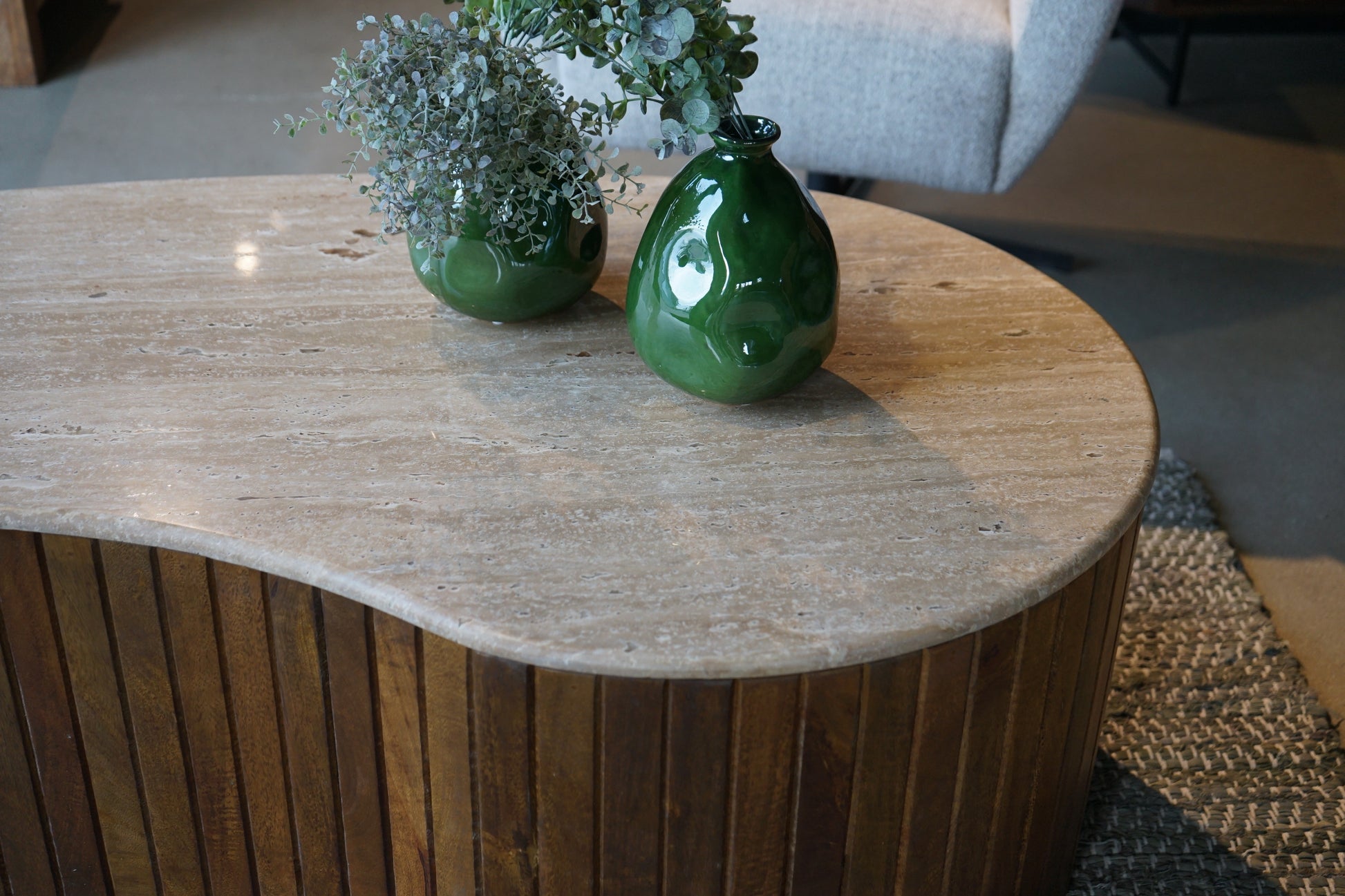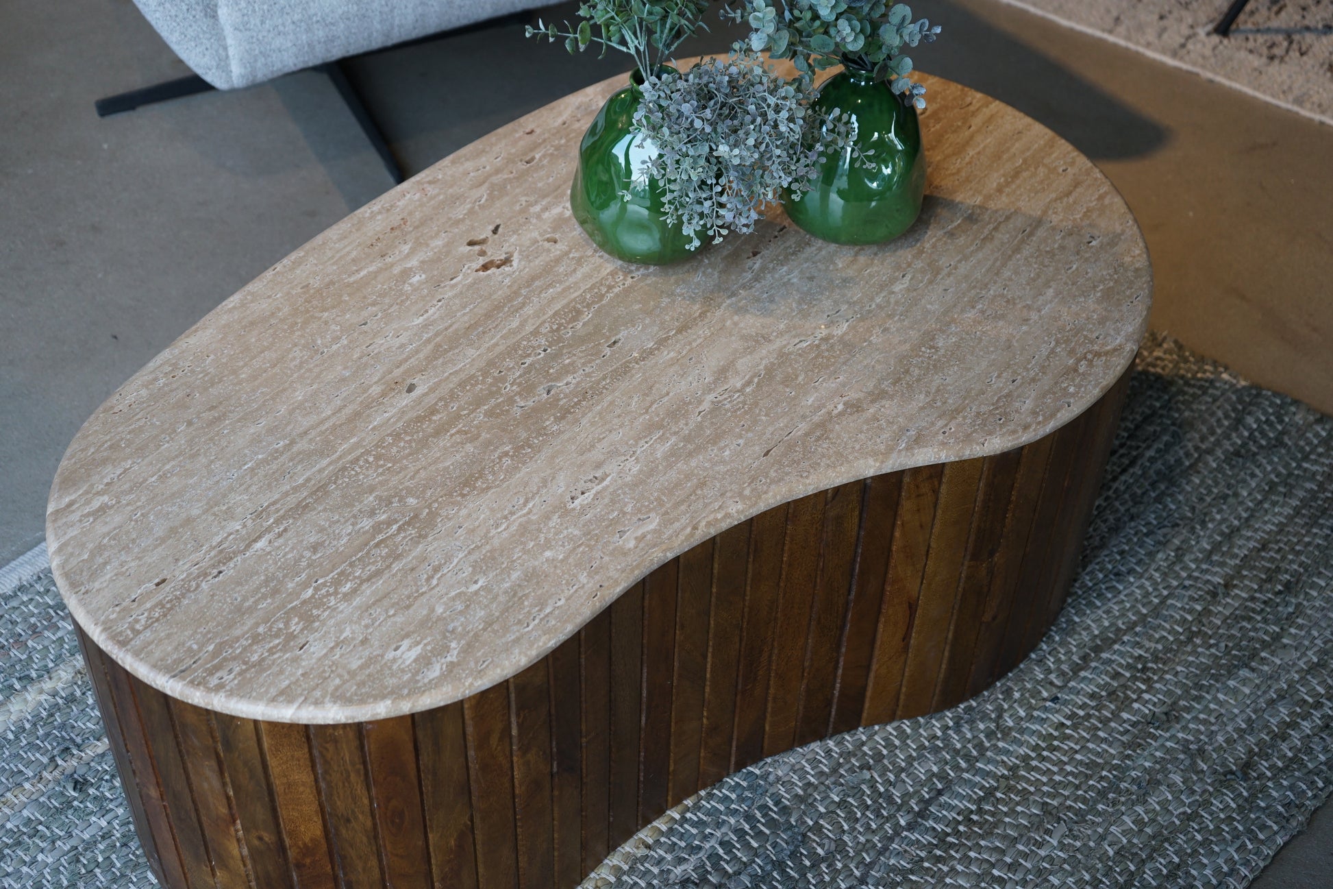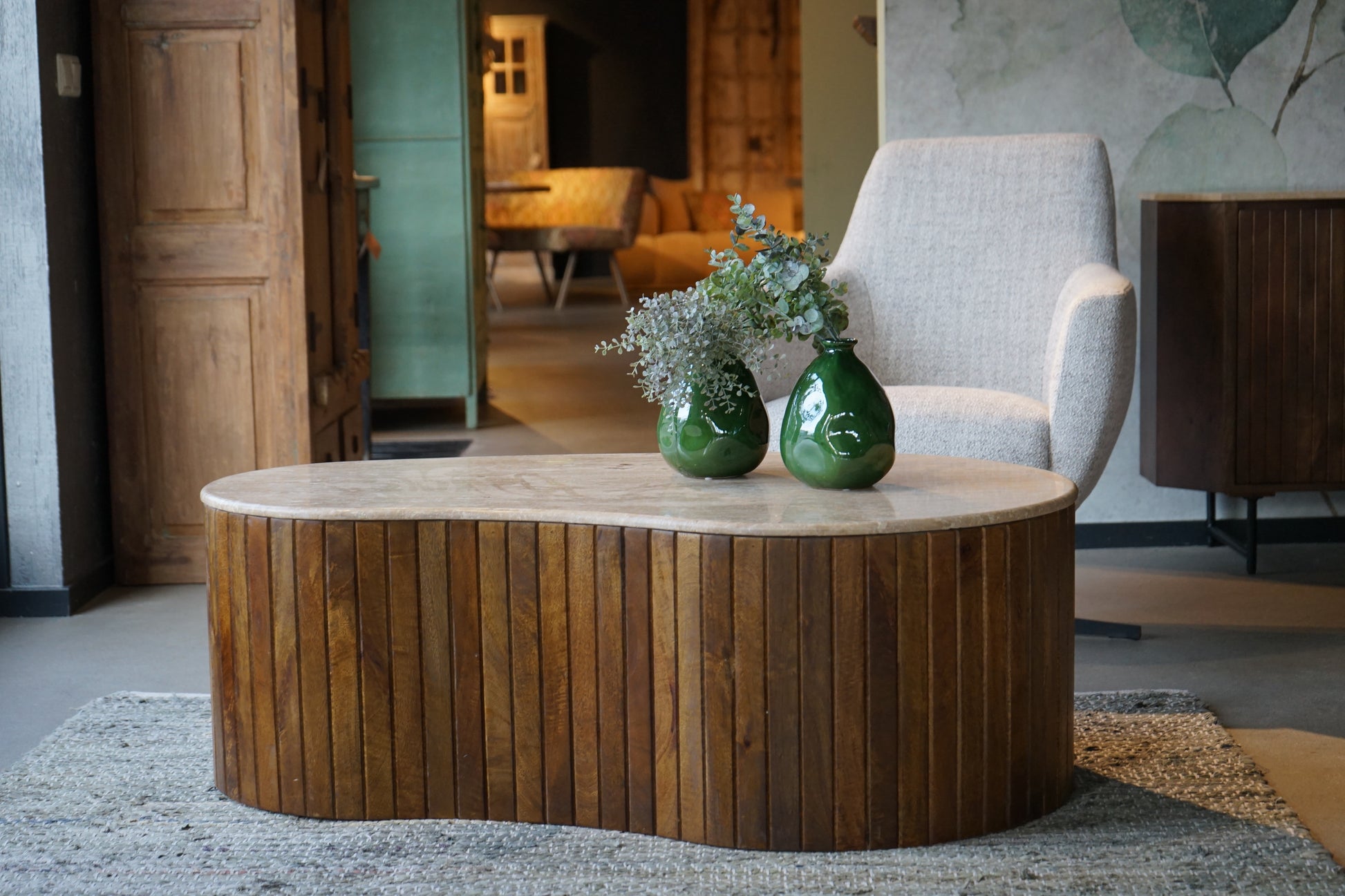 Deze Tirlot salontafel combineert organische vormen met de natuurlijke schoonheid van massief mangohout. De vloeiende, organische vorm zorgt voor een unieke uitstraling die perfect past in moderne en natuurlijke interieurs. Het massief mangohout geeft de tafel een warme, tijdloze uitstraling.